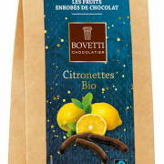 Citronettes enrobées de choc. noir bio 125gLe moelleux des lamelles de fruits confits délicatement, enrobées de chocolat noir |