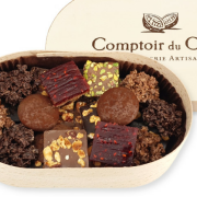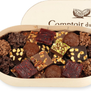 Assortiment chocolats- Carrés pralinés feuilletés: noisette, pistache, caramel beurre salé, pulpe de framboise. - Palets pralinés feuilletés : caramel beurre salé. - Carrés de chocolat noir 72% & lait 36% avec: noix de Pécan caramélisées, brisures de sablé Breton, amandes pralinées, noisettes, éclats de fèves de cacao (uniquement noirs), brisures de nougat (uniquement lait). - Bouchées de chocolat et brisures de cr |