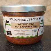 Sauce Bolognaise BIO riche en viandeSauce Bolognaise BIO riche en viande - 350 grs- Viande de bœuf origine France (La Ferme Duval) 40%, tomates bio, oignos bio, sel de Guérande, ail bio, fécule de maïs bio, sucre bio, épices bio |