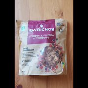 Muesli croustillant cranberry myrtille & framboise bioFavrichon Muesli croustillant Flocons d'avoine et blé français alliés à des notes fruitées et légèrement acidulées aux céréales complètes riche en fibres |