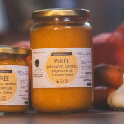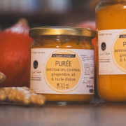 PUREE – Potimarron, carottes, gingembre, ail & huile d’olive – 375ml – VAL D’ARAC« Punchy et pleine de caractère » : plutôt inattendue comme description pour une purée ! Pourtant, le gingembre et l’ail viennent à merveille relever et parfumer le mariage tout doux potimarron-carottes : de quoi se réchauffer les papilles... et se réconforter les jours de grisaille (et les autres). |