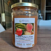 Purée de pêches de vignes et de pommescueillies, élaborée et mise en pot par l'association " Mettons du coeur dans les épinards!". |