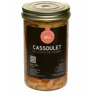 Cassoulet au confit de Canard 800grHaricots 56%, confit de canard 25%, saucisse pur porc (viande et gras de porc) 10%, bouillon (eau, carottes, oignons, poireaux, purée de tomates, sel, poivre), carottes |