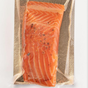Truite Fumée sachet sous vide 190g minimumCoeur de filet de truite des Fjords, mariné aux épices (poivre timut du Népal, coriandre, graines de moutarde, citronelle,sucre roux de canne, salage à sec, fumage au bois de hêtre |