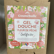 Gel Douche Fleur de Pêche bio BIB 3LNettoie naturellement et délicatement la peau et l’enveloppe d’un voile de douceur naturellement parfumé à la fleur de pêcher. Enrichi en Aloe Vera bio, il laisse la peau hydratée et protégée. Usage quotidien pour toute la famille dès 3 ans. |
